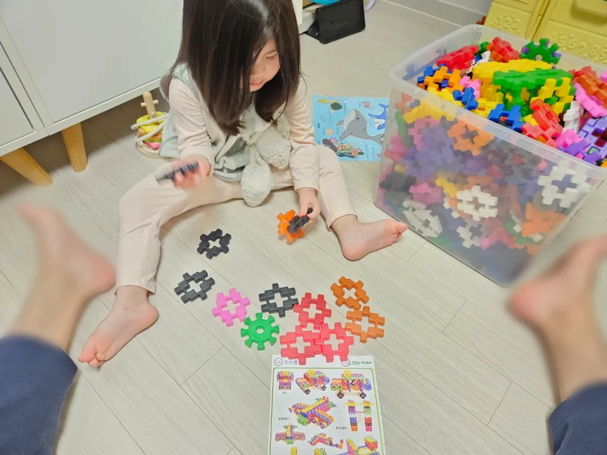오늘은 무얼 만들지 하면서 고민 중인 모습입니다. 함께 만들다 보면 제가 생각지도 못하는 방식으로 블럭을 연결해서 높이 세우기도 하고, 집중하는 모습에 아빠는 뿌듯합니다. 블럭 놀이를 할 때면 이것저것 만들어 달라며 아빠를 찾는 큰 딸입니다. 약간의 부작용으로 아빠가 더 열심히 하게 된다는 사실은 비밀입니다. ㅋㅋㅋ