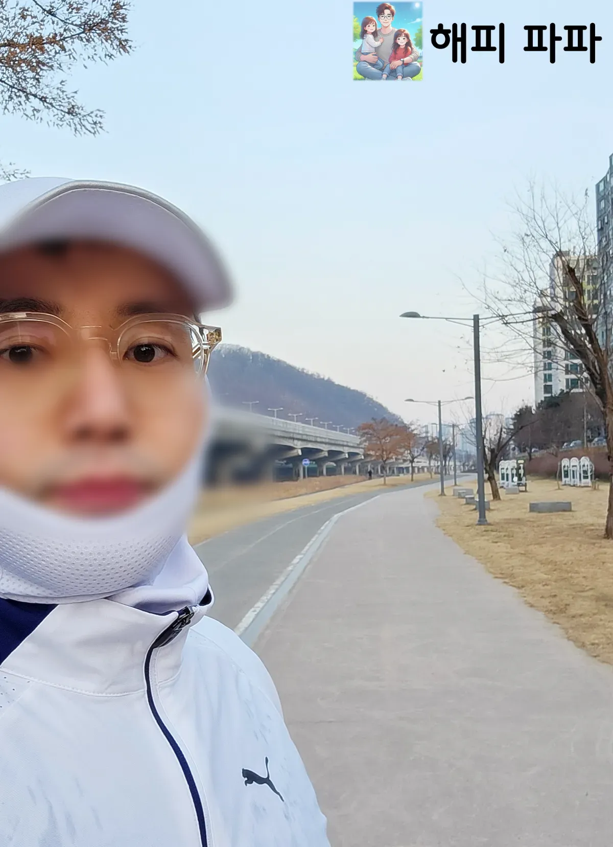 달리기를 시작하기 전에 찍은 모습입니다. 따뜻한 집에서 방금 나와, 러닝을 시작하기 전까지는 더더욱 몸을 따뜻하게 보호해야 합니다. 그래서 저는 코까지 모두 가리고 달리기 시작합니다.