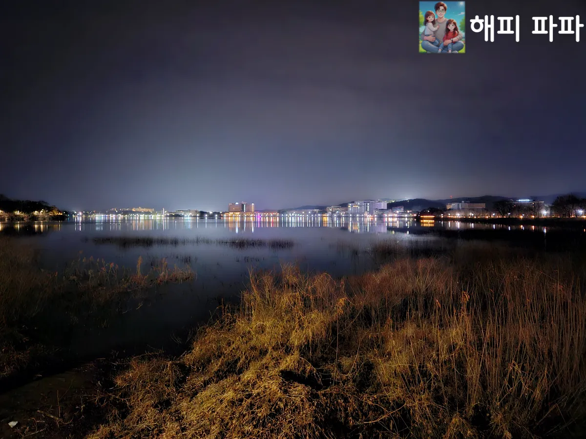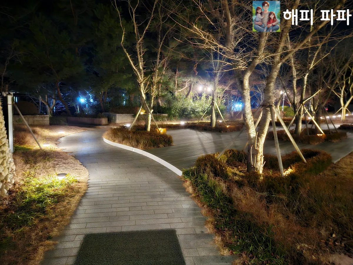힐튼호텔 주변 나무다리에 불빛이 들어와 있고, 그 뒤쪽으로 경주월드 스노우파크의 모습이 보였다. 낮은 기온 때문인지 나무 데크로 만들어진 다리 위 표면이 얼어 있어서 미끄러웠다. 오르고 내리는 부분에는 멍석이 깔려있었지만, 물 위에 만들어진 다리라 평지 부분이 얼어있기에, 겨울철 러닝이나 산책 시에는 더욱 조심해야 할 것 같다.