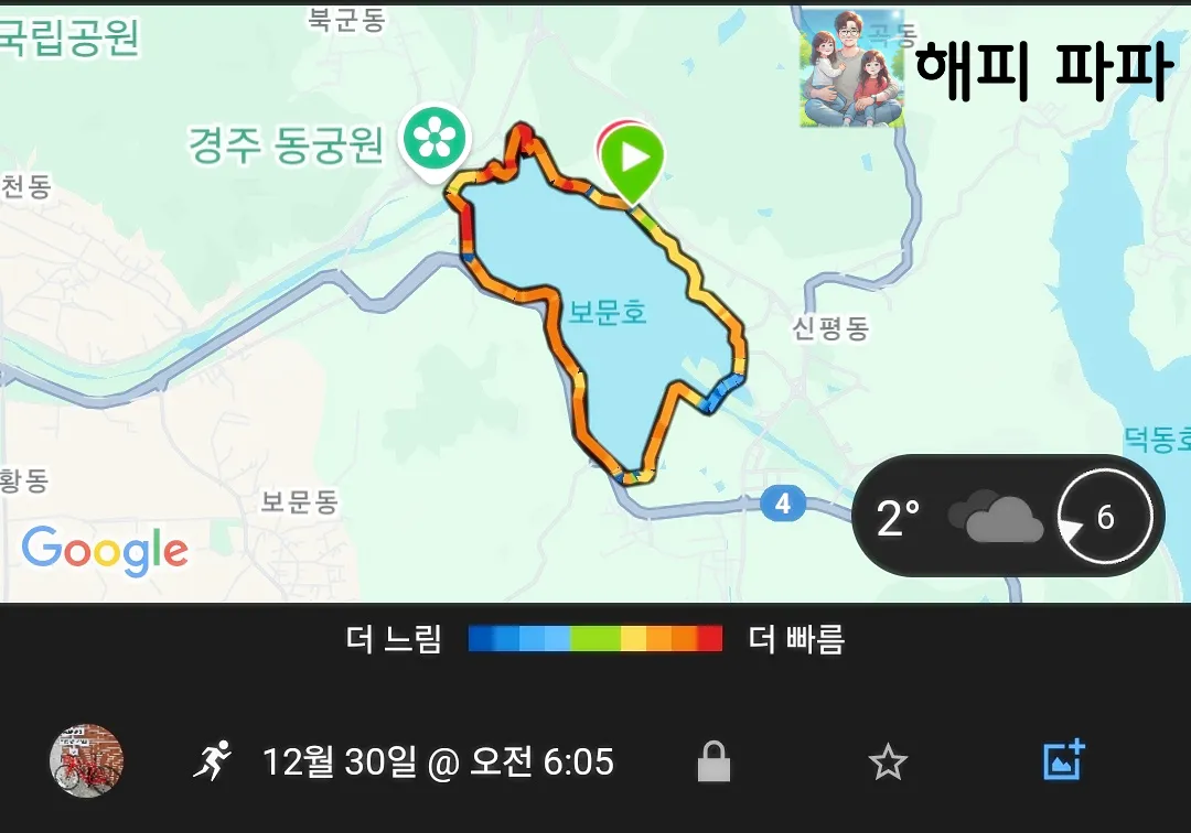 출발은 라한셀렉트 경주에서 시작을 하였다. 물놀이를 좋아하는 2살, 3살 연년생 딸들을 위해 경주 가족여행에 숙박을 하는 호텔이다. 먼저 거리는 약 6.5km로 위 지도에 표시된 호수를 한 바퀴 도는 거리이다. 초보 러너도 부담 없는 1km 7:00 페이스로 달려도 46분이면 한 바퀴를 달릴 수 있다. 걸어서 산책을 한다면 대한민국 성인 기준 평균 시속이 4.5Km이니, 약 1시간 30분 정도 걸릴 것으로 예상된다.