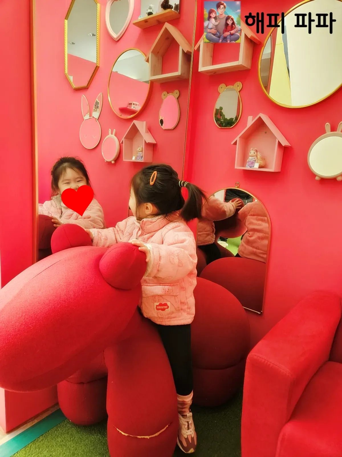 첫째가 좋아하길래, 둘째를 안고 같이 사진을 찍으려는데 격하게 거부를 한다. 색깔도 진한 핑크색이라 압도적인 크기와 함께 두려운 것 같다.