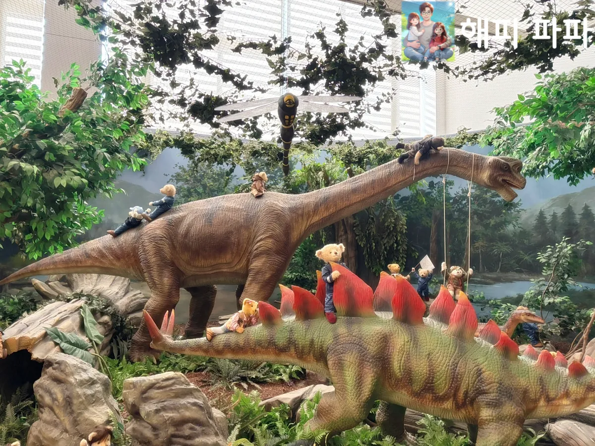 공룡이 살던 시대에 존재한 대형 잠자리도 있고, 공룡 목에 줄을 연결해 그네를 타는 곰돌이 인형도 있다. 시간이 허락한다면 2층 공룡 월드도 함께 구경해 보길 권한다.