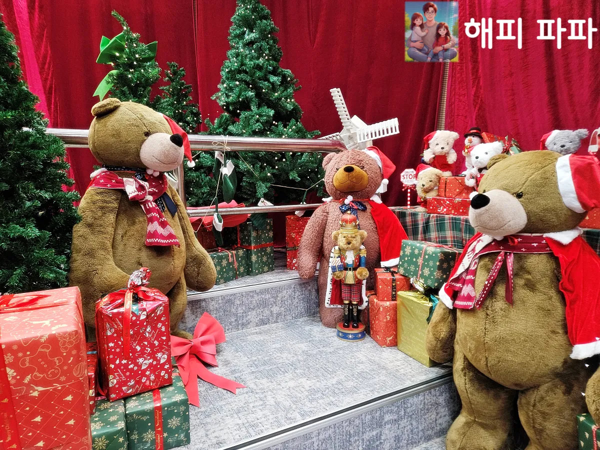 대형 핑크 토끼가 있던 극장에 가면 선물 상자와 함께 산타 곰돌이 인형도 만날 수 있다. 또한 대형 핑크토끼 옆에 곰돌이로 만든 트리도 있으니 구경해 보길...