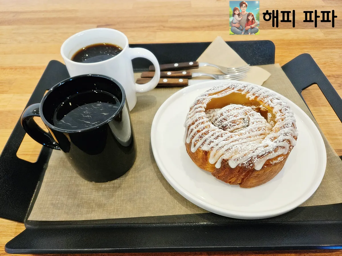 아내와 함께 아메리카노 2잔과 애플 시나몬 빵을 주문했다.
