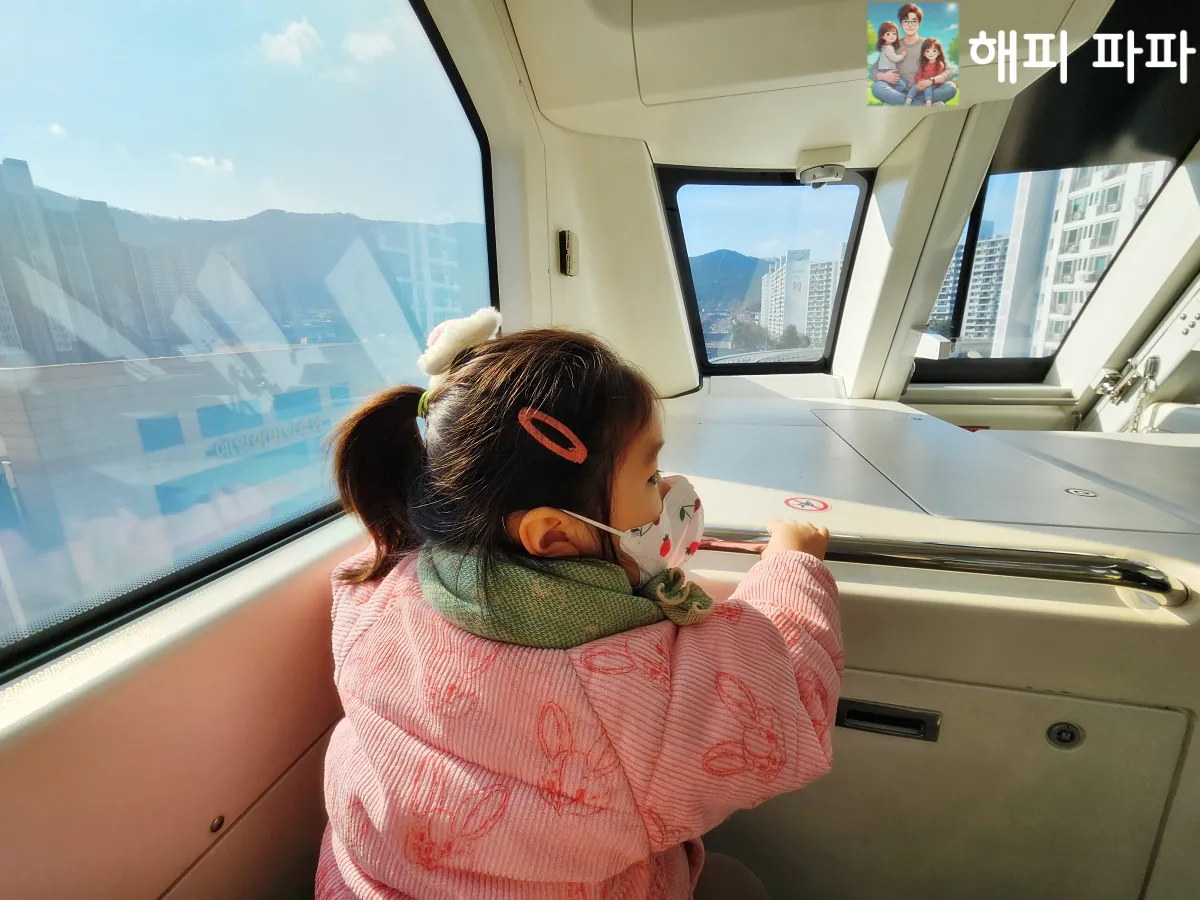 이렇게 편안하게 앉아 대구 하늘을 달리며 도심 구경이 가능하다. 참고로 3호선은 30개 역, 전체 24km를 48분 만에 달린다. 멋진 경치를 구경할 수 있어 어른들도 한 번 이용해 보면 좋을 것 같다. 아이가 좀 더 크면 3호선을 타고 대구 명소 서문시장에 가서 맛있는 군것질을 잔득하고 오는 것도 재미있을 것 같다.
