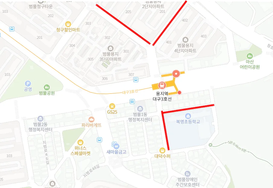 3호선 열차를 타기 위해 용지역을 방문할 경우, 주차가 가능한 지역을 표시했다. 위 지도의 빨간 선 부분이 주차가 허용되는 구간이다. 공용 주차장이 마련되어 있지는 않지만, 제법 넓은 공간이 마련되어 있어 주차에 큰 불편은 없을 것이다.