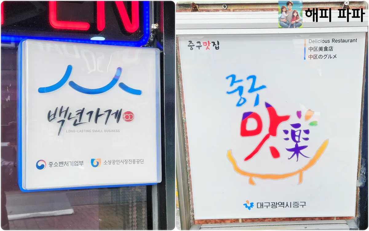 가게 메인 출입문에는 중소벤처기업부의 백년가게 인증이 붙어있다. 중화반점이 세워지고 대를 이어 71년째를 맞이하는데 1세대만 더 이어진다면 100년은 문제없다. 기둥의 메뉴판 아래에는 대구시 중구청에서 지정한 중구 맛집 표시도 있다. 야끼우동은 이미 대구광역시 10미(味)로 지정되어 있고, 그 원조가 바로 동성로에 있는 중화반점이다.