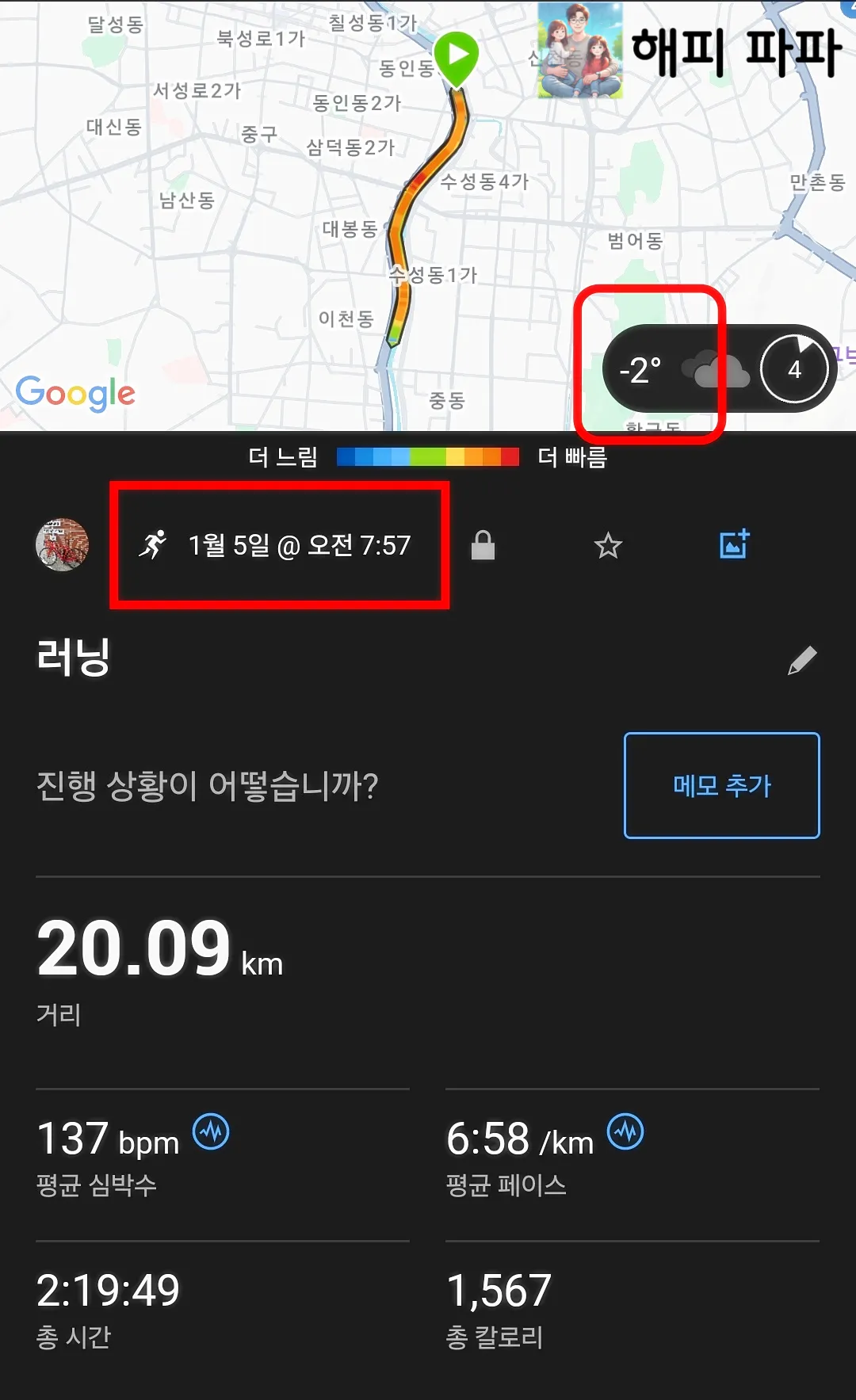 1월 5일 아침 7시, 옷이 도착하자마자 다음날 바로 대구 러닝성지 신천을 달렸다.
