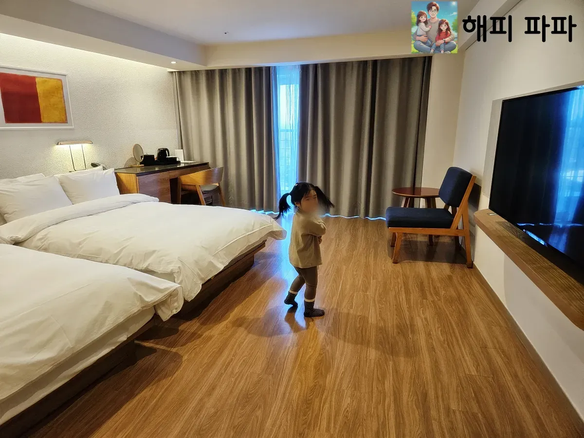 패밀리 트윈 객실은 디럭스 객실보다 규모가 약 2평 정도 공간이 넓습니다. 아이들과 함께 하다 보면 유모차, 캐리어에 짐이 정말 많습니다. 넓은 객실은 짐을 두기에 여유 있는 공간을 제공합니다. 또한 아이들이 TV를 보고 뛰어다니며 놀기에도 공간이 넓어서 안전합니다.