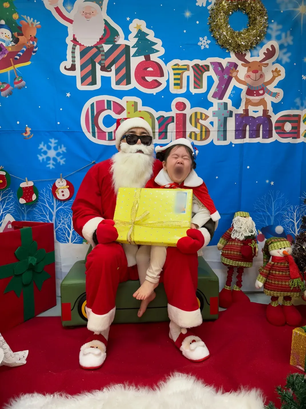 내심 아빠를 발견하지 않을까 기대를 했던 첫째, 자기 순서가 되어 저한테 걸어오는 순간 펑펑 울기 시작했습니다. 내년 2월이면 만 3살이 되는 큰 딸의 반응에 저도 살짝 당황하기 시작했네요. 역시 큰 기대는 실망을 안겨주네요. 작년 크리스마스에 다른 아빠 산타 품에 안겨 우는 게 안타까워, 1년 전부터 기다린 행사였는데 아빠의 희망도 무너졌습니다. 산타를 모르는 아이들에게는 무서운, 아빠 산타만 즐거운 시간이었습니다.