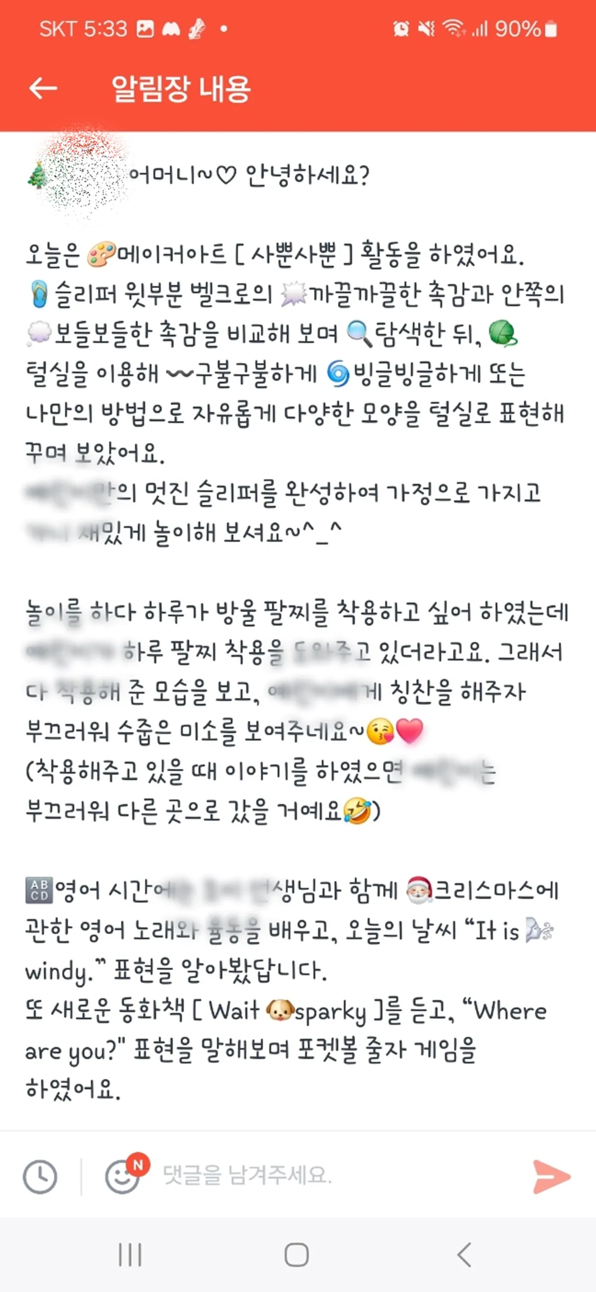 알림장에는 우리 아이가 오늘 하루를 무엇을 하면서 보냈는지를 선생님께서 자세히 설명을 해주십니다. 퇴근 후 아이에게