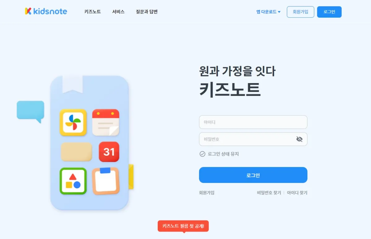 PC에서 처음으로 키즈노트를 검색을 해보았는데 위와 같은 화면이 나오네요. 원과 가정을 잇는 키즈노트, 부모님들의 마음을 잘 아는 좋은 어플, 앱인 거 같습니다.