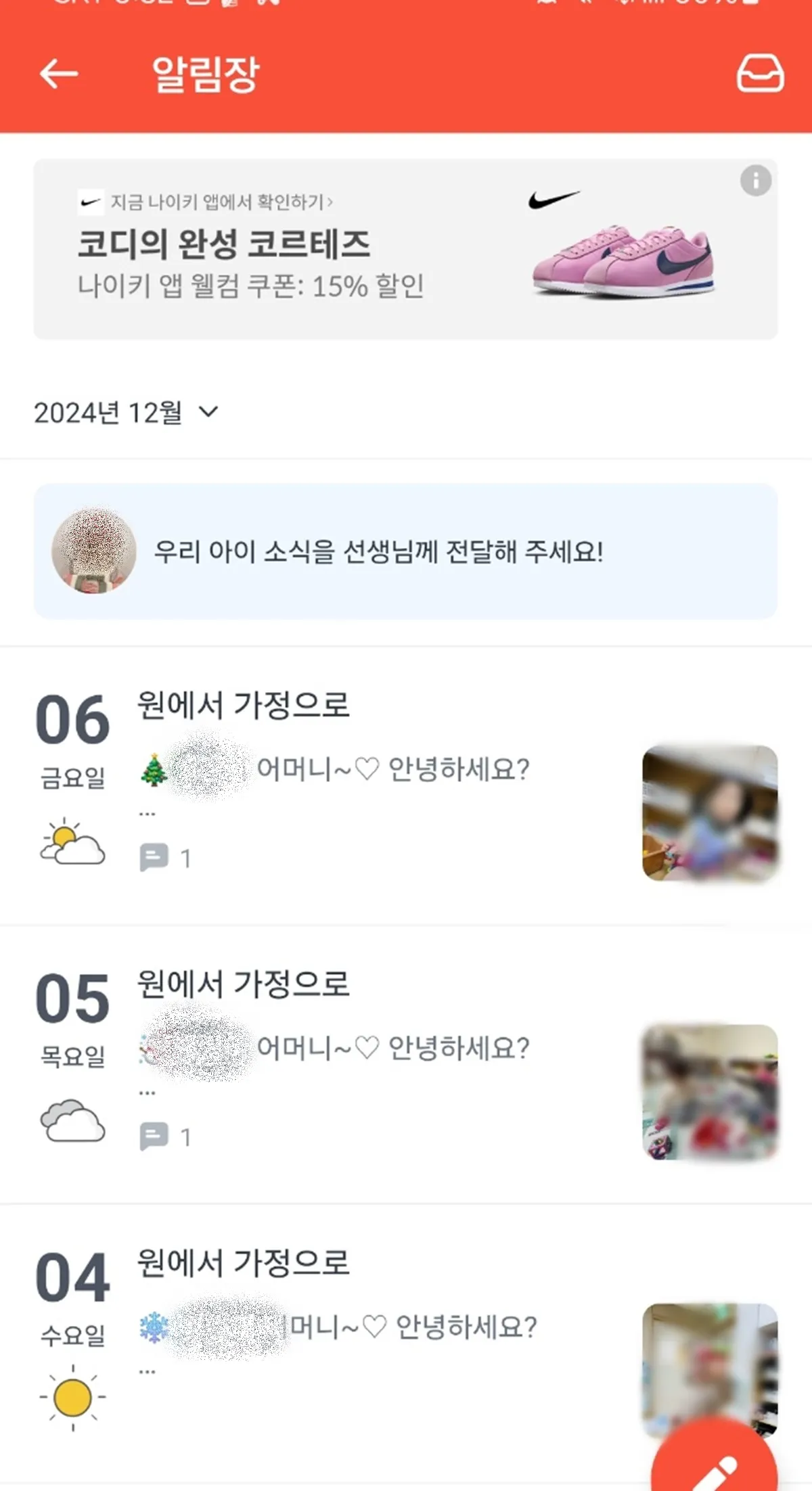 키즈노트 어플의 알림장에는 아이가 등원을 한 날짜의 기록들이 하루하루 일기처럼 잘 정리되어 남아 있습니다.