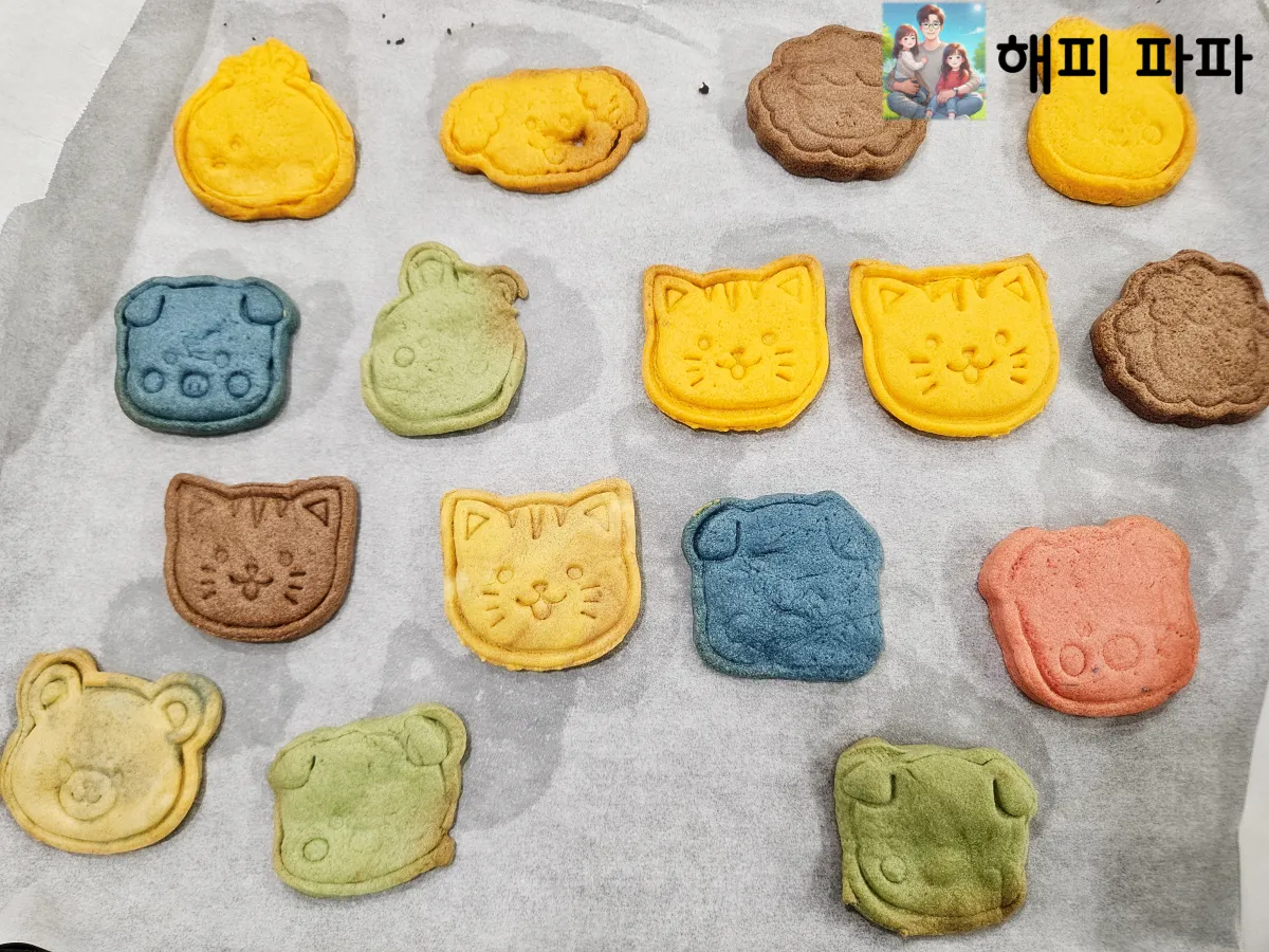 예전에 구입한 쿠키용 커터로 동물 얼굴 모양을 만들어 보았다. 딱 보면 알겠지만, 4살이 만든 것과 아빠가 만든 것은 차이가 난다. 아빠가 열심히 꾹 눌러 만들었다 ㅋㅋㅋ